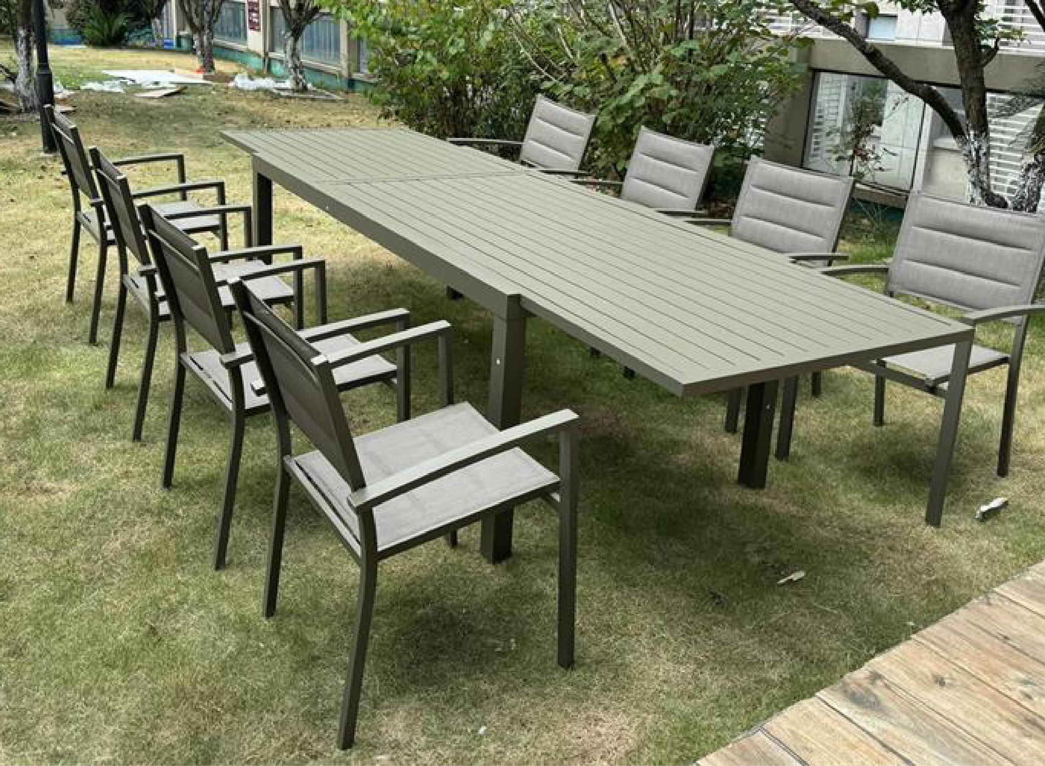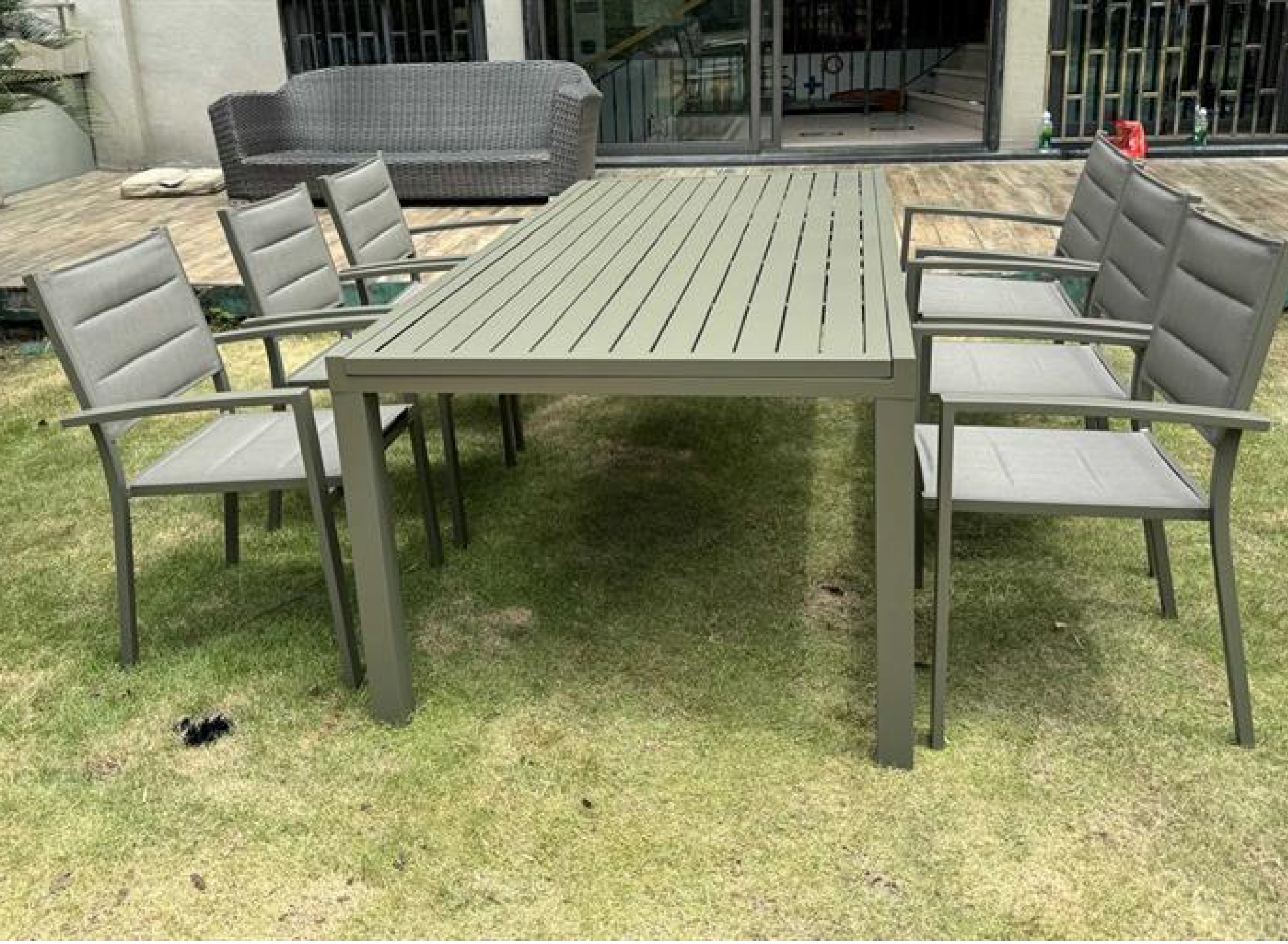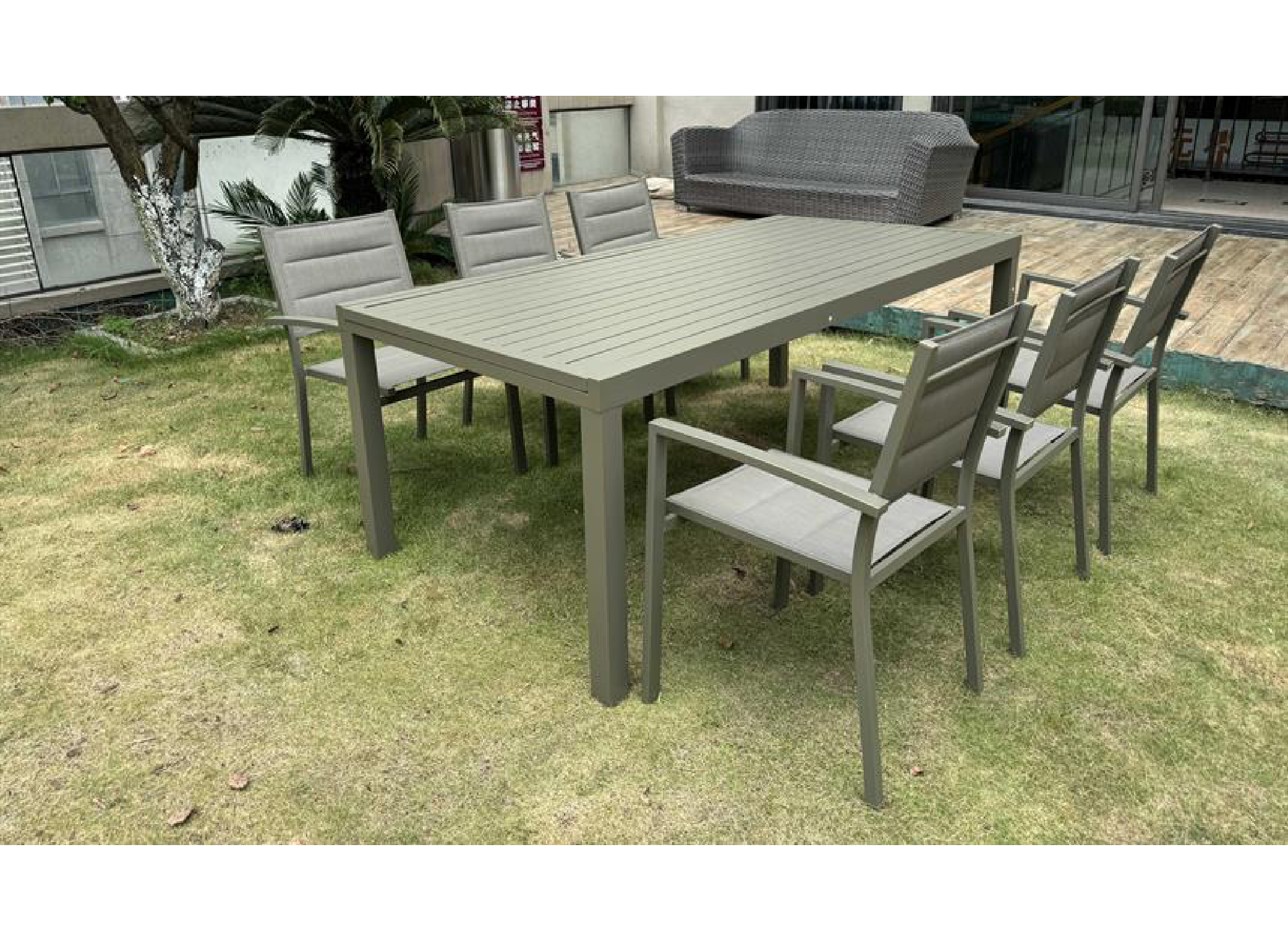 שולחן גינה/מרפסת נפתח ל-3.2 מ' + 6 כיסאות (שמפניה/אפור)